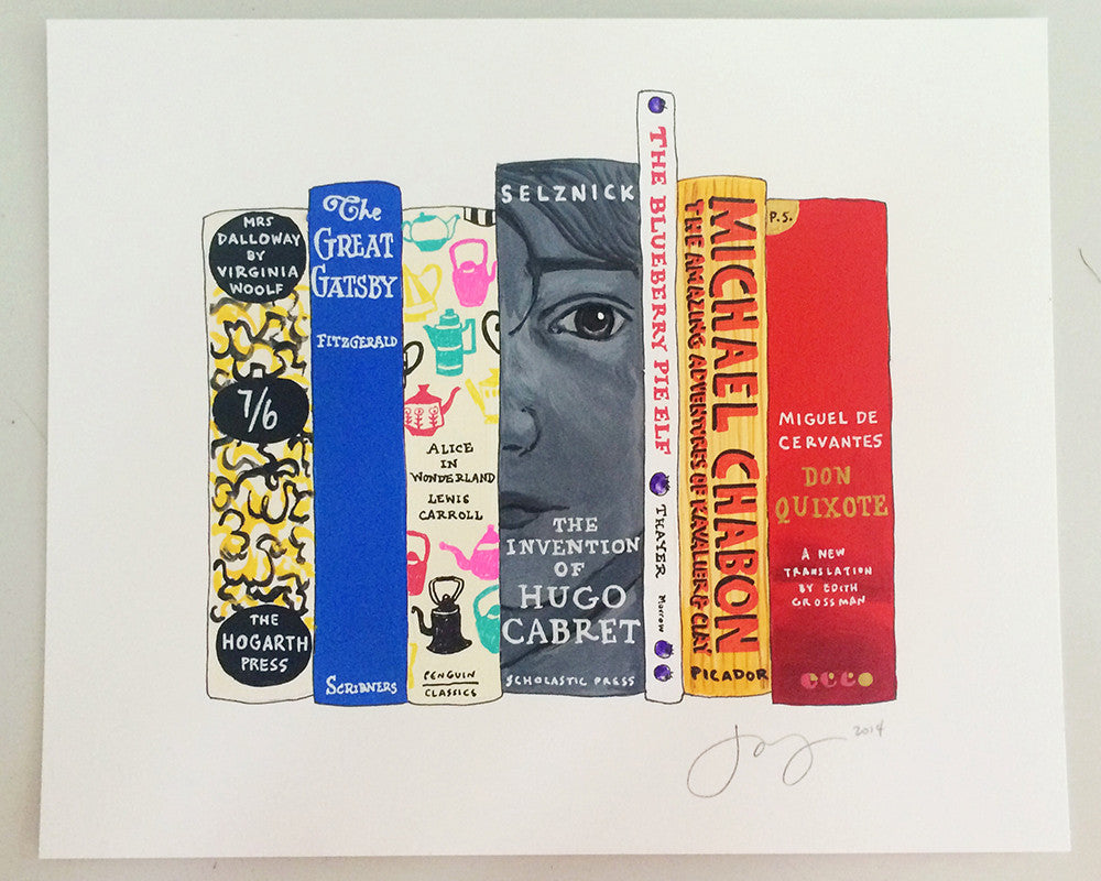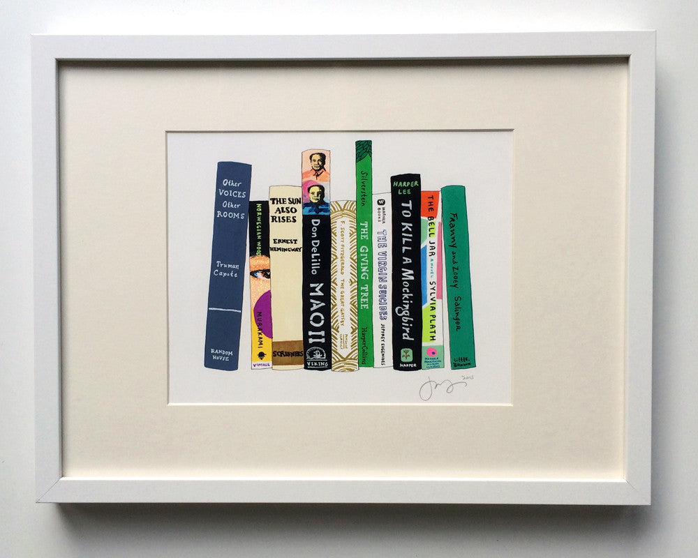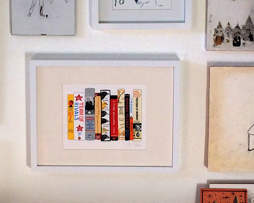 Choose either 6x8" (about the size of a paperback book), 8x10" (slightly smaller than a normal sheet of letter-size paper), 11x14", 13x18", or 16x20", depending on the number of books you want to include. You can also choose to have the painting framed in a simple, elegant, white, black, or natural wood frame, with a white mat. The 8x10" painting will be framed in an 11x14" frame, the 11x14" and 13x18" in a 16x20" size frame, and the 17x22" in a 20x24" size frame. Framing is done by the wonderful folks at Simply Framed and usually adds 2-3 weeks to the lead time.