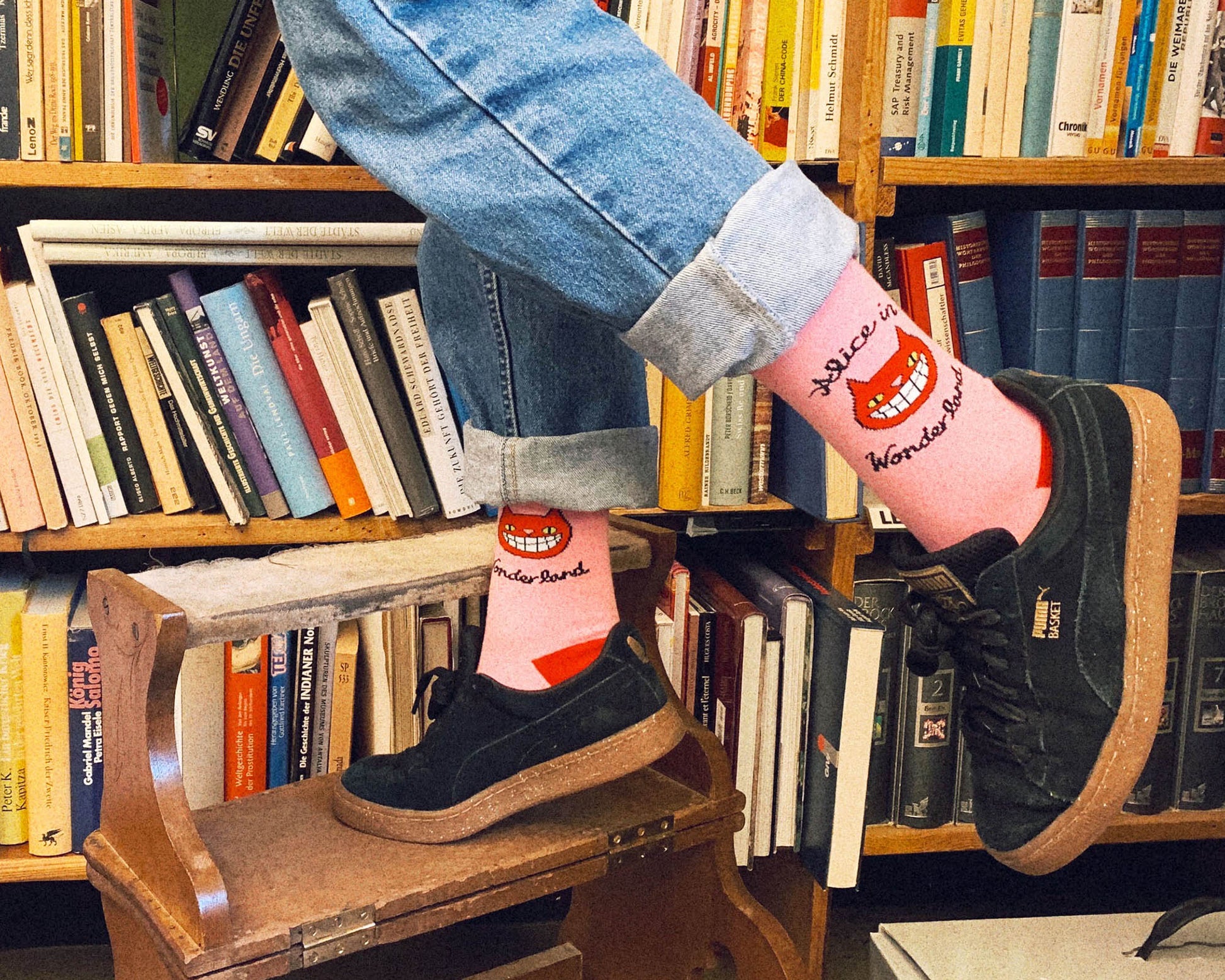 On this pair, the Cheshire Cat grins at the awesome weirdness of Lewis Carroll's Alice in Wonderland.