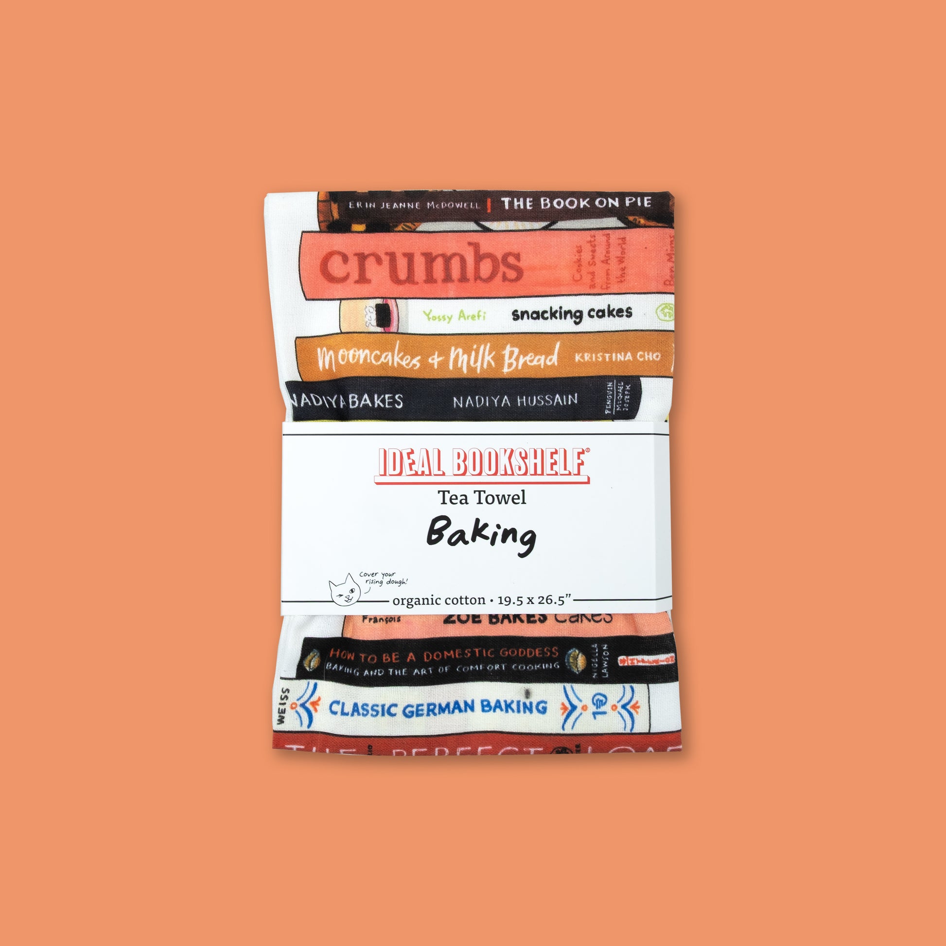 A soft, very lightweight (quick-drying!) organic cotton flour sack tea towel covered in baking cookbooks, perfect for your kitchen!