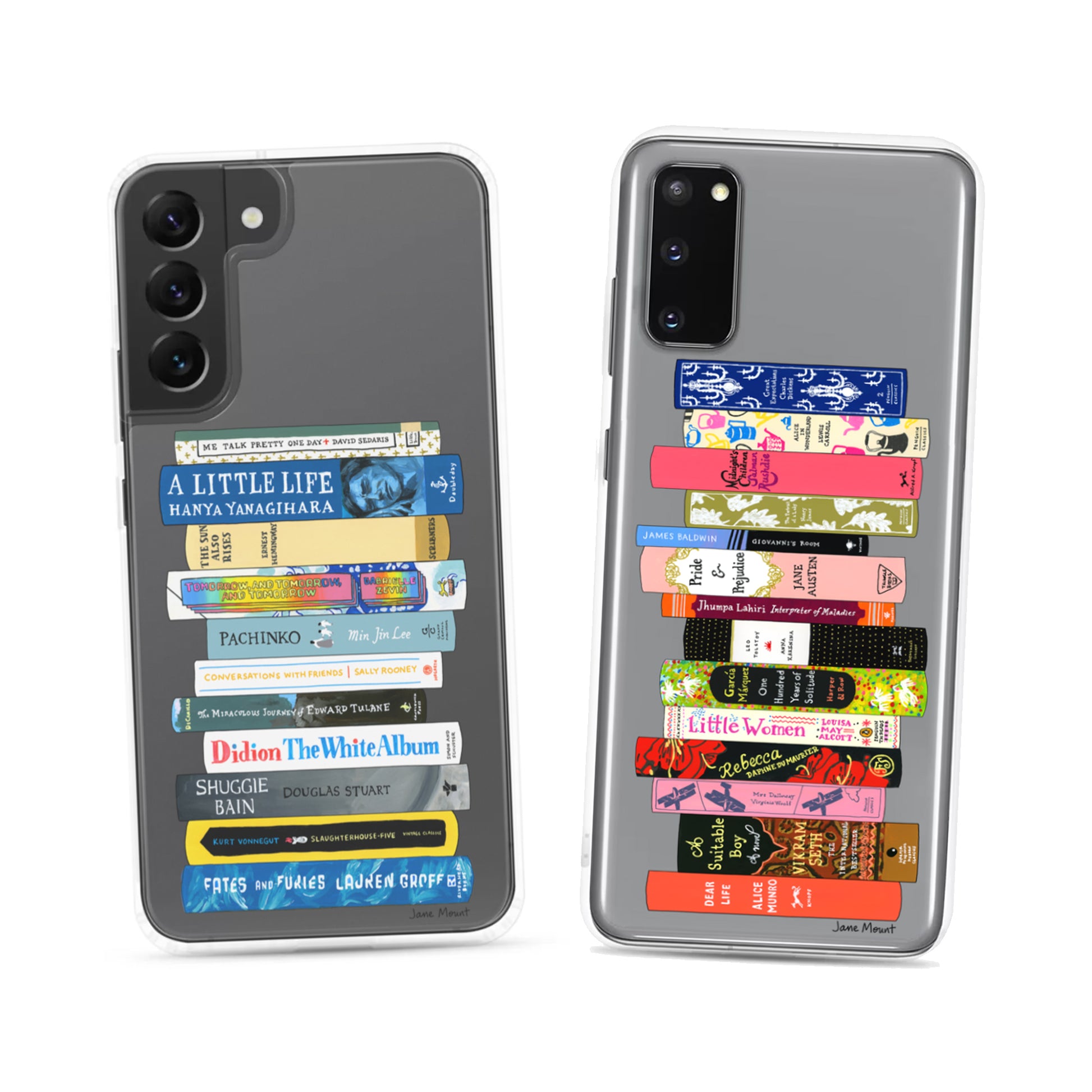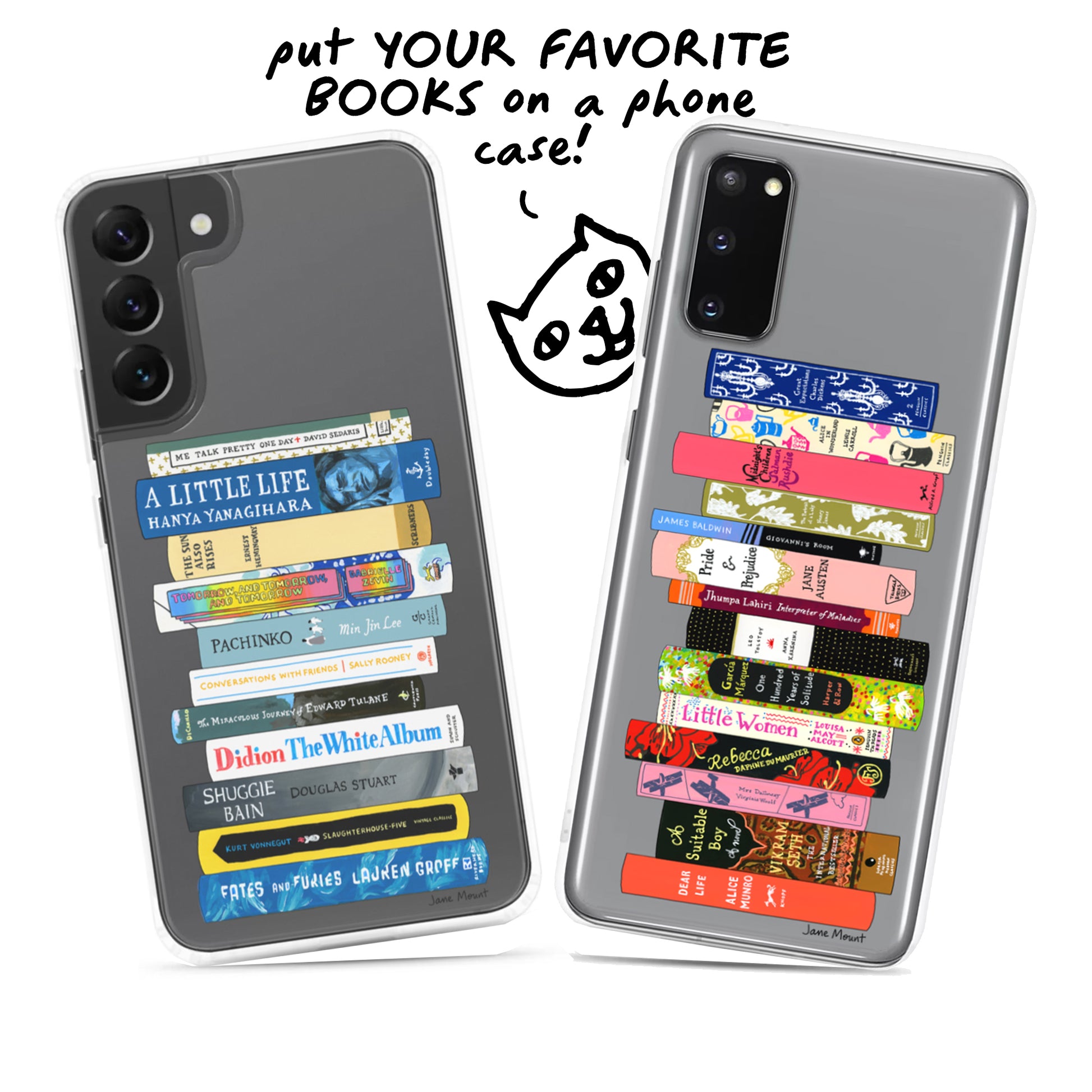 Jane will make a custom print of YOUR FAVORITE BOOKS on a phone case, just for you! All you have to do is choose which phone model you have, then pick your favorite books from our list , and Jane will arrange the books to best fit your case. You can also browse the full book list here.