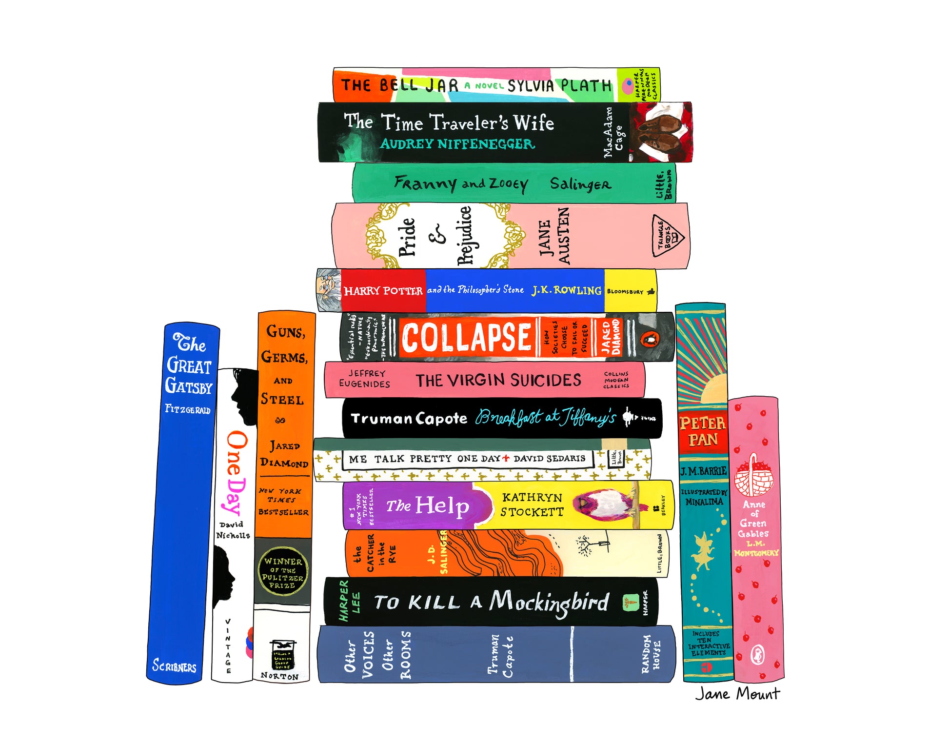 This is a print of the favorite books of KB, painted by Jane Mount.